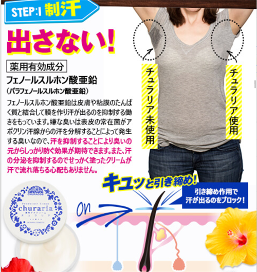 チュラリアには汗腺を引き締める「有効成分フェノールスルホン酸亜鉛」と、殺菌作用のある「有効成分シメン-5-オール」が配合されています。