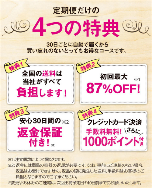 さらにこの定期コースは回数の縛りがないことや初回限定で30日間全額返金保証があること。