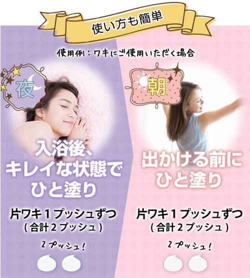片ワキ1プッシュずつ、夜は入浴後の肌が清潔なとき、朝はお出かけ前にお使いください。
