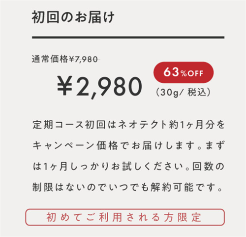 公式サイトの定期購入なら初回は通常価格の63%OFFの税込2,980円。