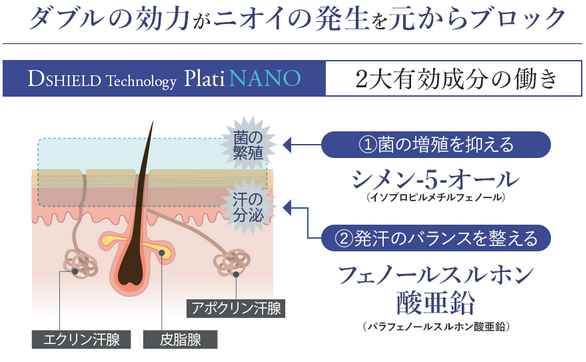 2. アポクリン腺の分泌物と反応し悪臭を防ぐ 3. 皮膚のpHを調整して健康な皮膚環境を保つ |
