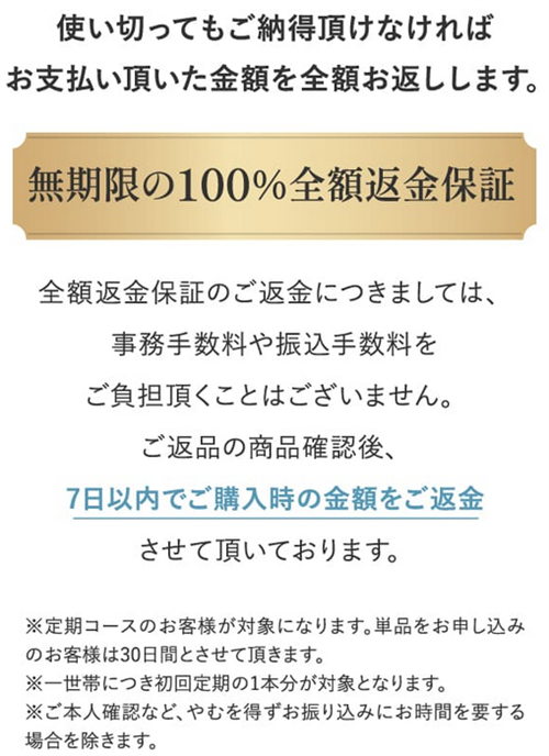 全額返金保証は定期コースの場合は「無期限」ですが単品購入の場合は「30日間」となります。