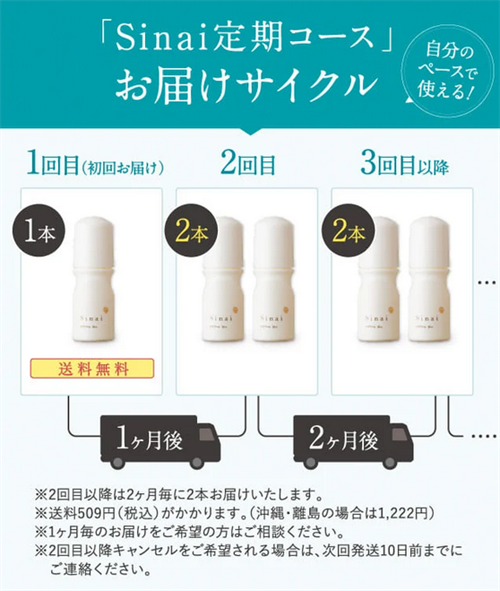 Sinai(シナイ)の定期コースは毎月自動的に商品が発送されるシステムで、解約や休止の連絡があるまでずっと続きます。